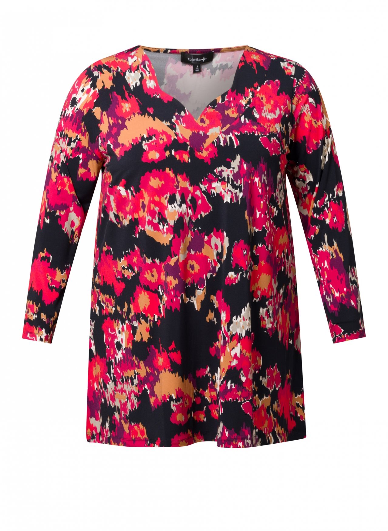 Een tuniek die direct kleur geeft aan je dag! De rode print valt mooi op de donkere ondergrond, terwijl de soepele jersey stof zorgt voor comfort en bewegingsvrijheid. Het A-lijn model met flatterende halslijn maakt dit item ideaal om te combineren met een zwarte broek of legging.