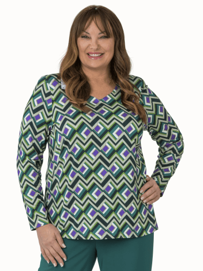 Schoudervullingen, lange mouwen. Een print in groen, lila, zand, zwart. Materiaal: 100% viscose .Lengte maat 44 = 68cm.